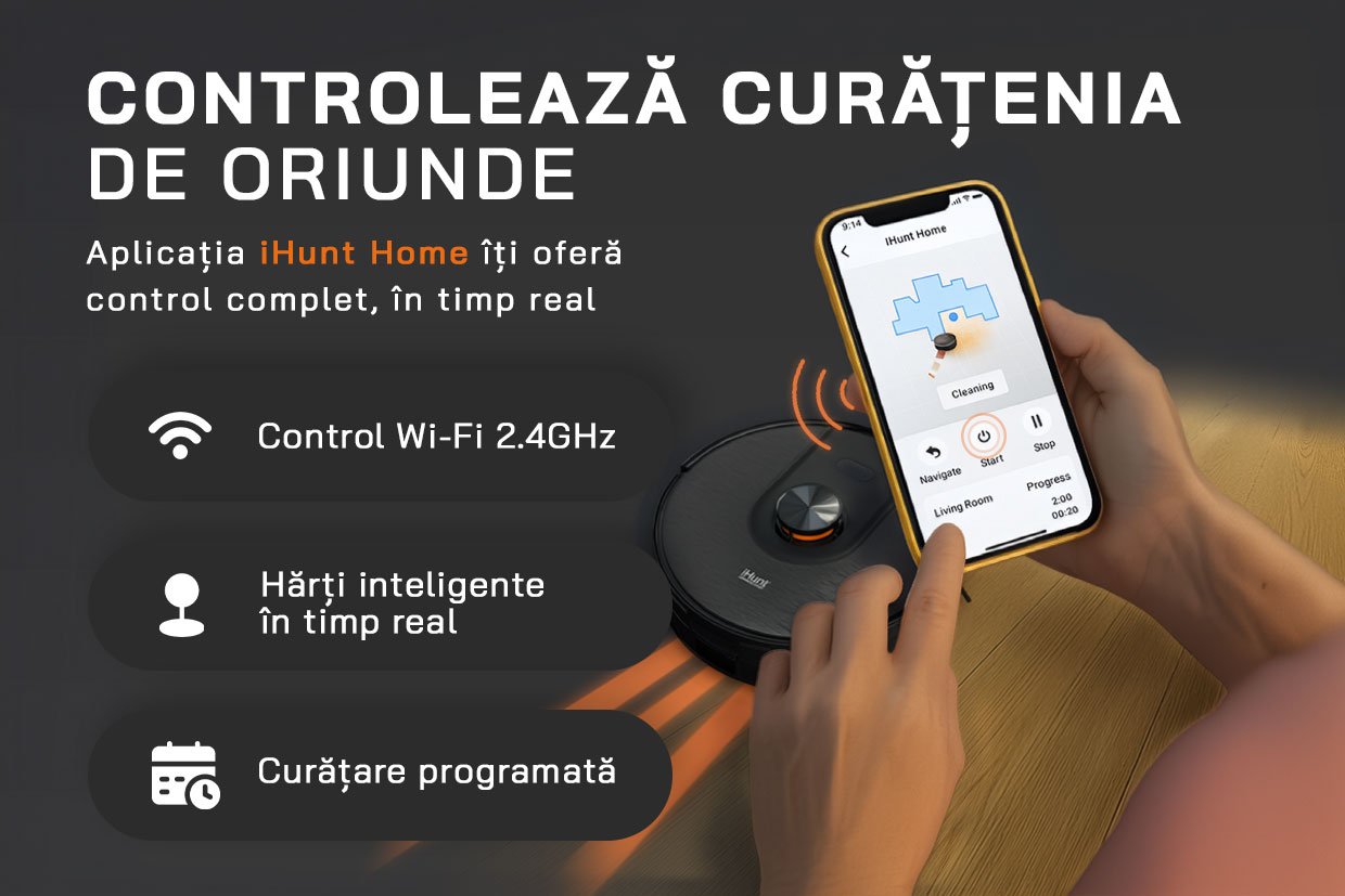 Functii: Avertizare sonoră; Programabil; Curățare automată; Indicator baterie descărcată; Baterie reîncărcabilă; Variator de putere (Quiet/Standard/Strong/MAX); Încărcare automată; Senzor anti-cădere; Senzor anti-coliziune; Control din aplicația iHunt Home; Mop cu reglaj debit apă (High/Medium/Low); Carpet B