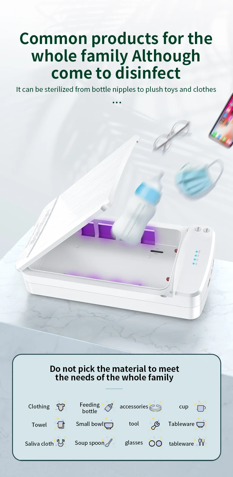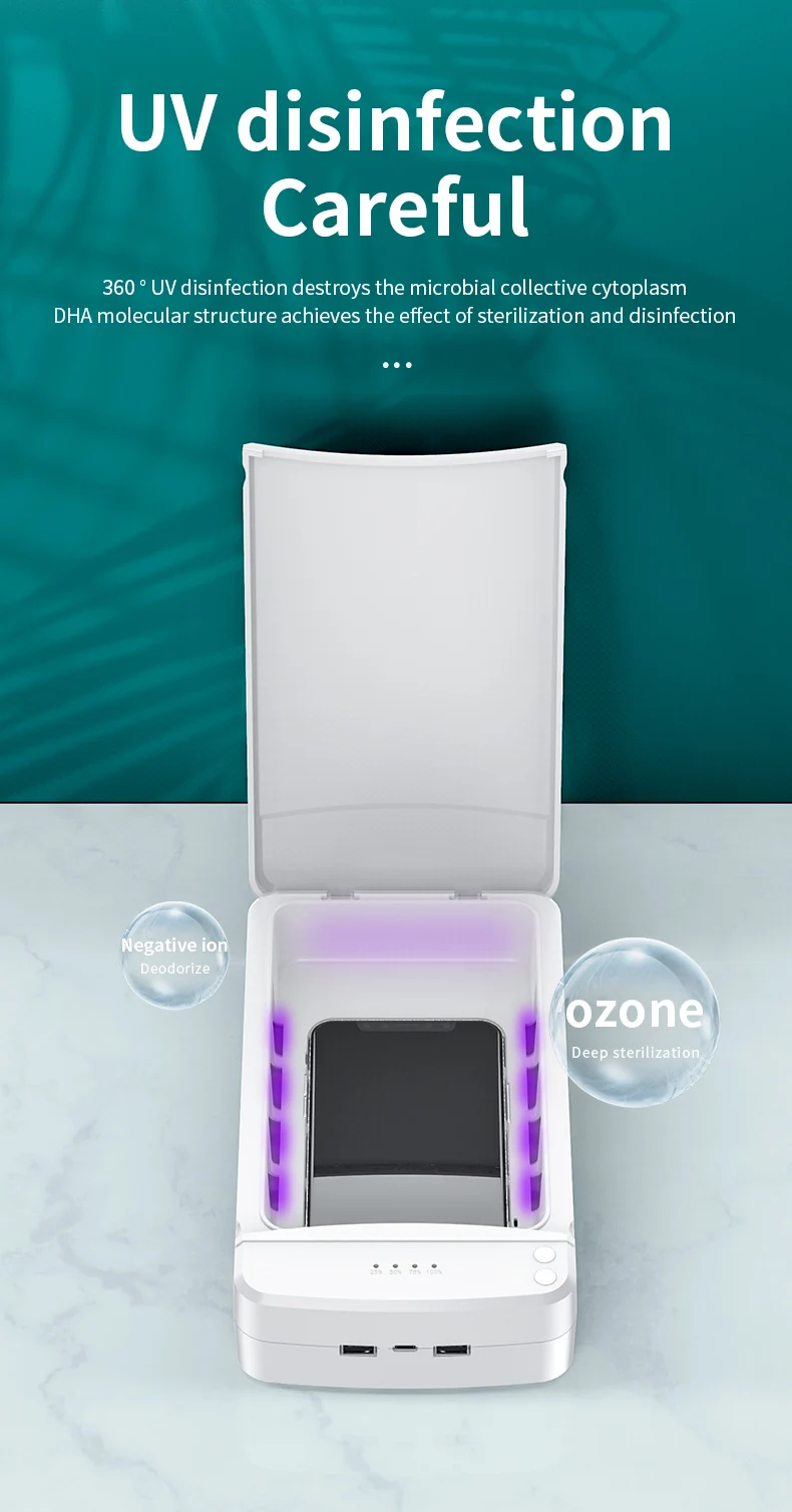 1. Put the phone in the inner cavity of he disinfection box(no need to shut down), close the cover, press the disinfection button, the phone will start to disinfect and the disinfection will end after 5 minutes.