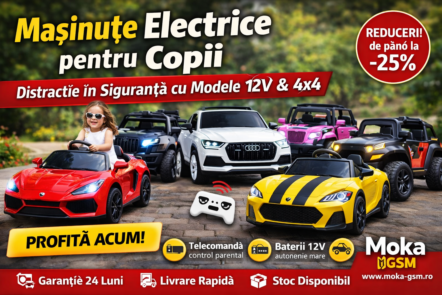 Descoperă gama completă de mașinuțe electrice pentru copii, ATV-uri electrice, buggy-uri și vehicule 4x4, create special pentru distracție, siguranță și dezvoltare. Fie că alegi o mașină electrică pentru copii cu telecomandă, un ATV electric sau un buggy off-road, copilul tău va avea parte de o experiență realistă de condus.